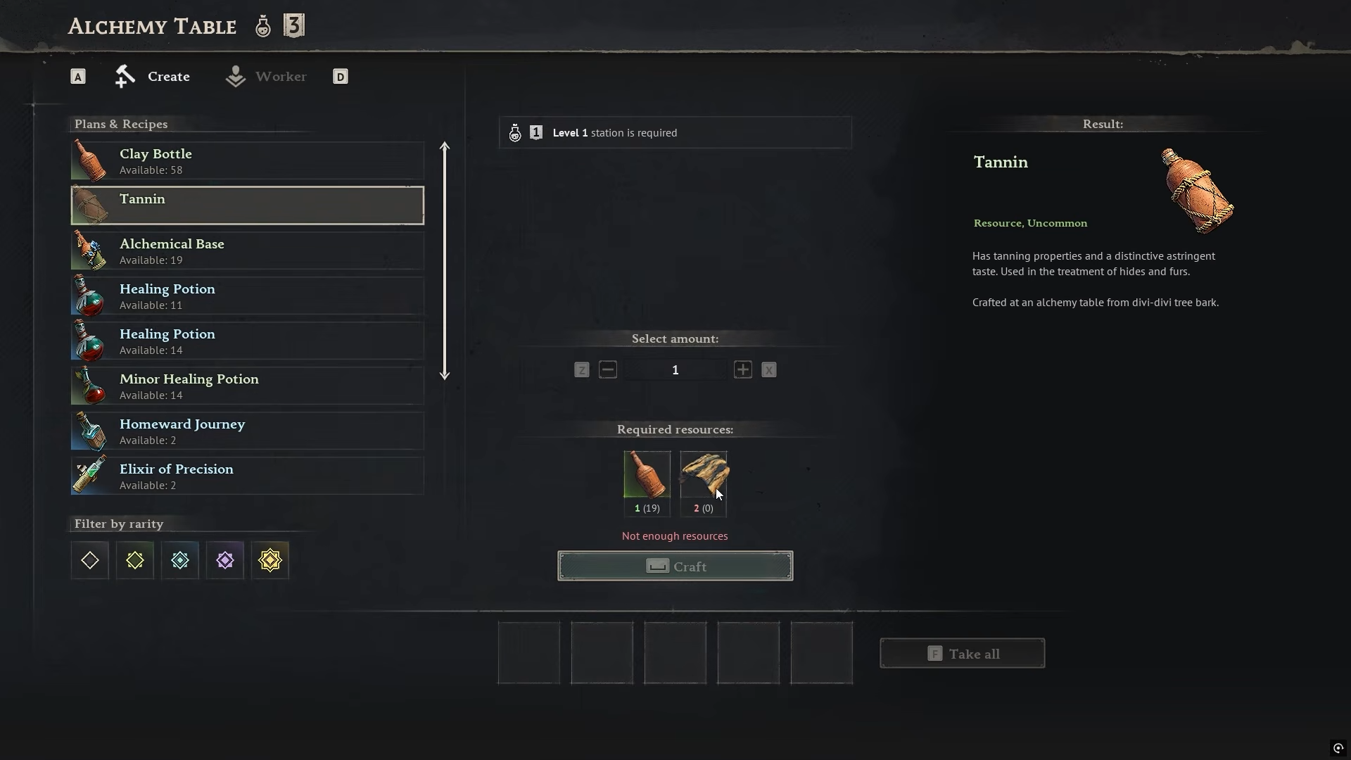 Produce Tannin at the Alchemy Table using Clay Bottle and Tree Bark.