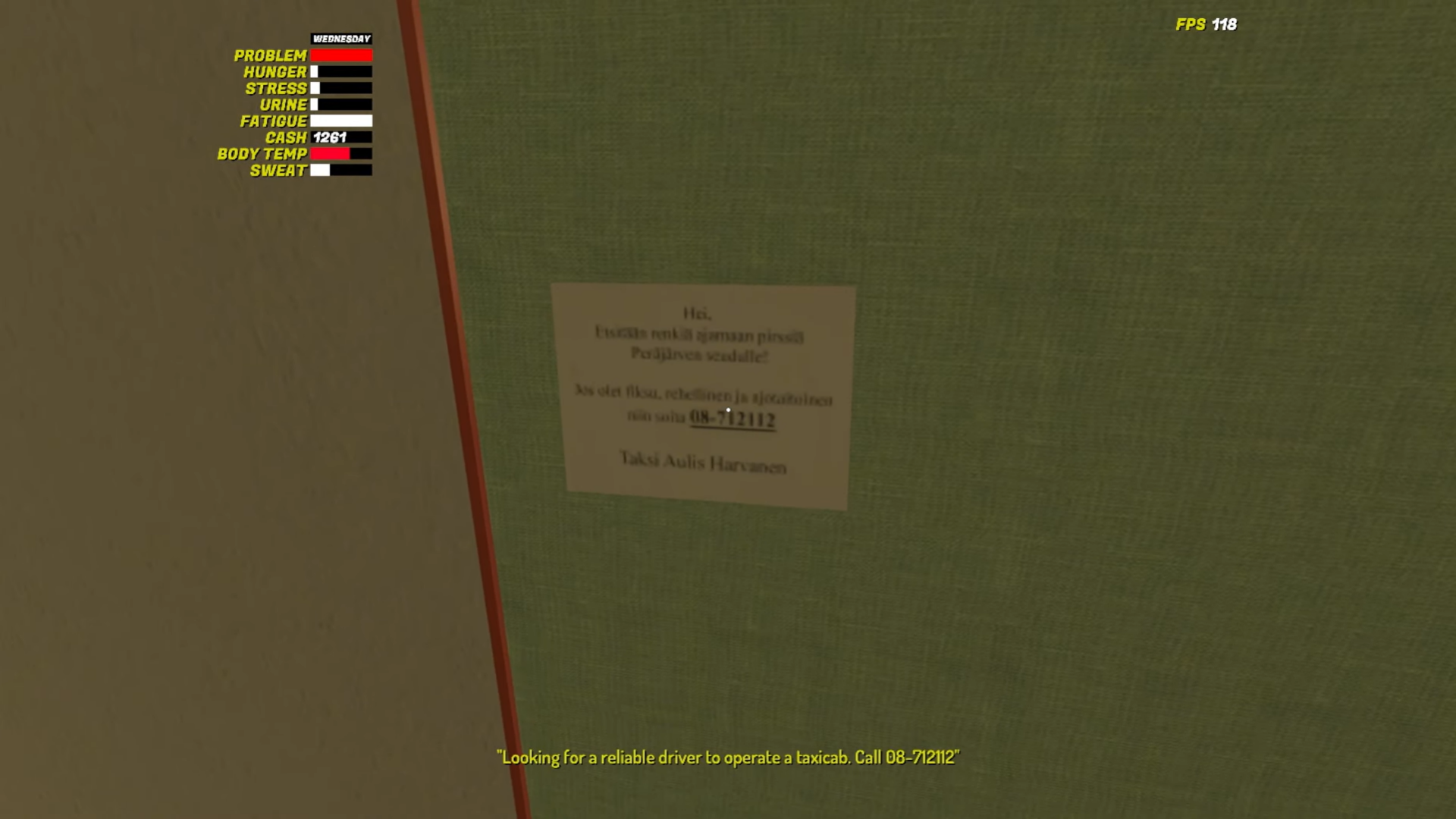 Go to the gas station restaurant and look at the job board on the wall. There’s a poster that says “Taxi driver wanted”. Read it carefully to get the phone number.