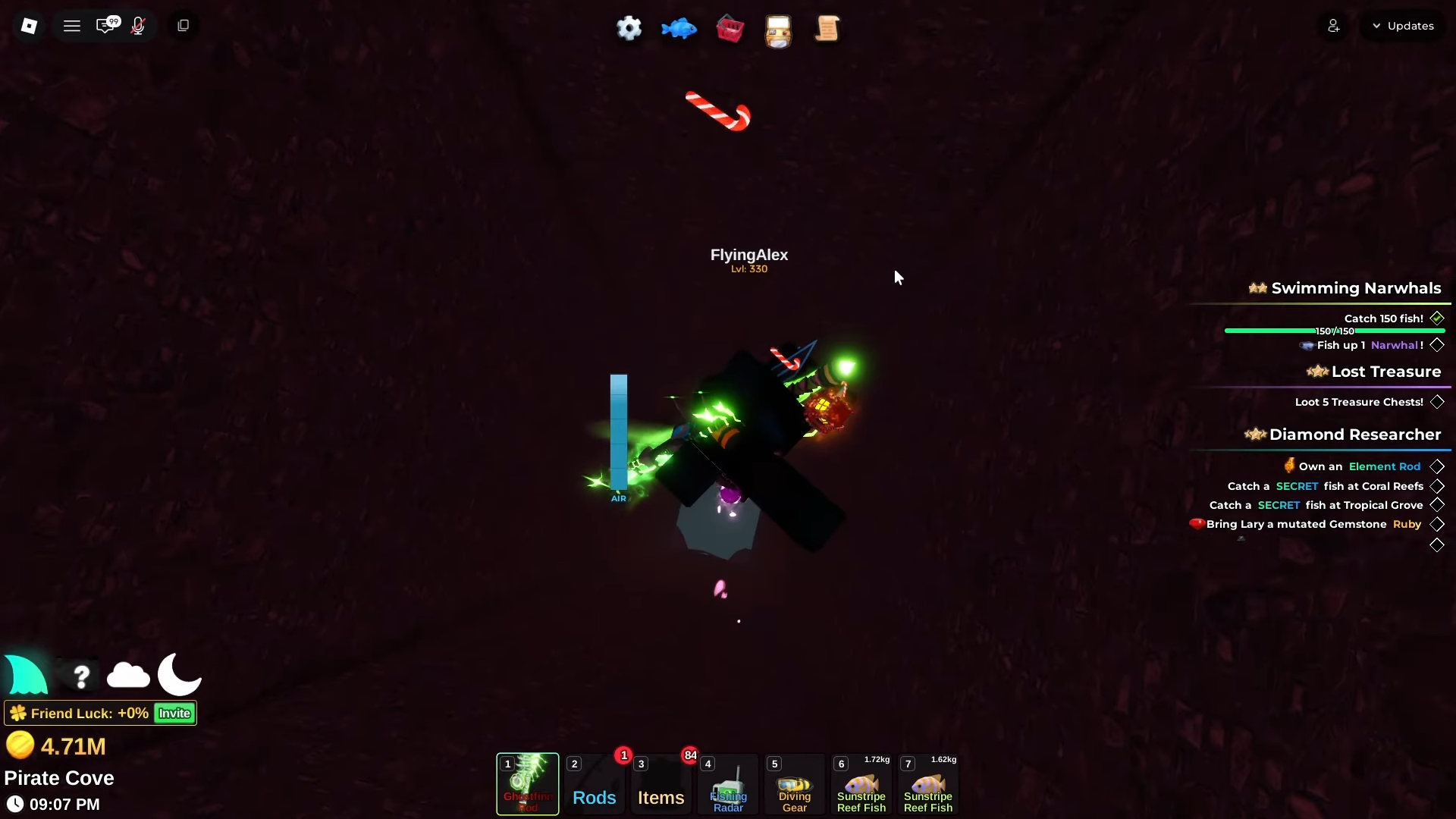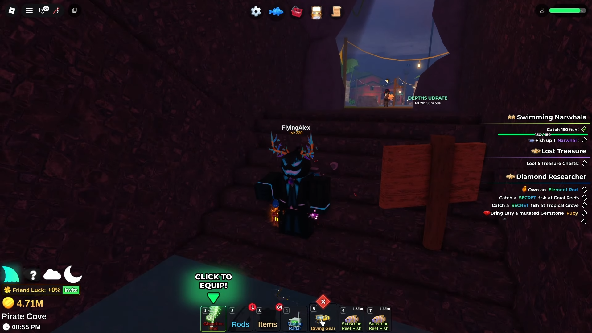 • Complete the Dead Man Skeleton quest in Pirate Cove’s underwater maze by collecting four letters from respawning treasure chests.