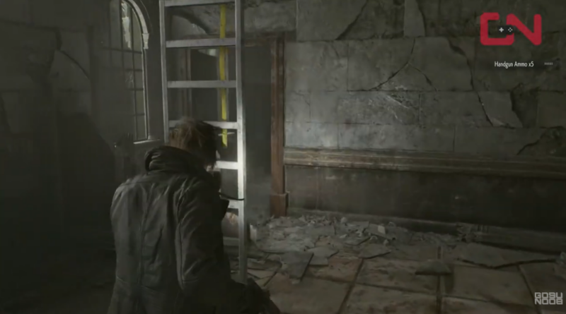 You cannot simply walk down initially. Instead, look for a silver ladder and shoot it. This drops the ladder and allows you to climb down safely to the first floor area.