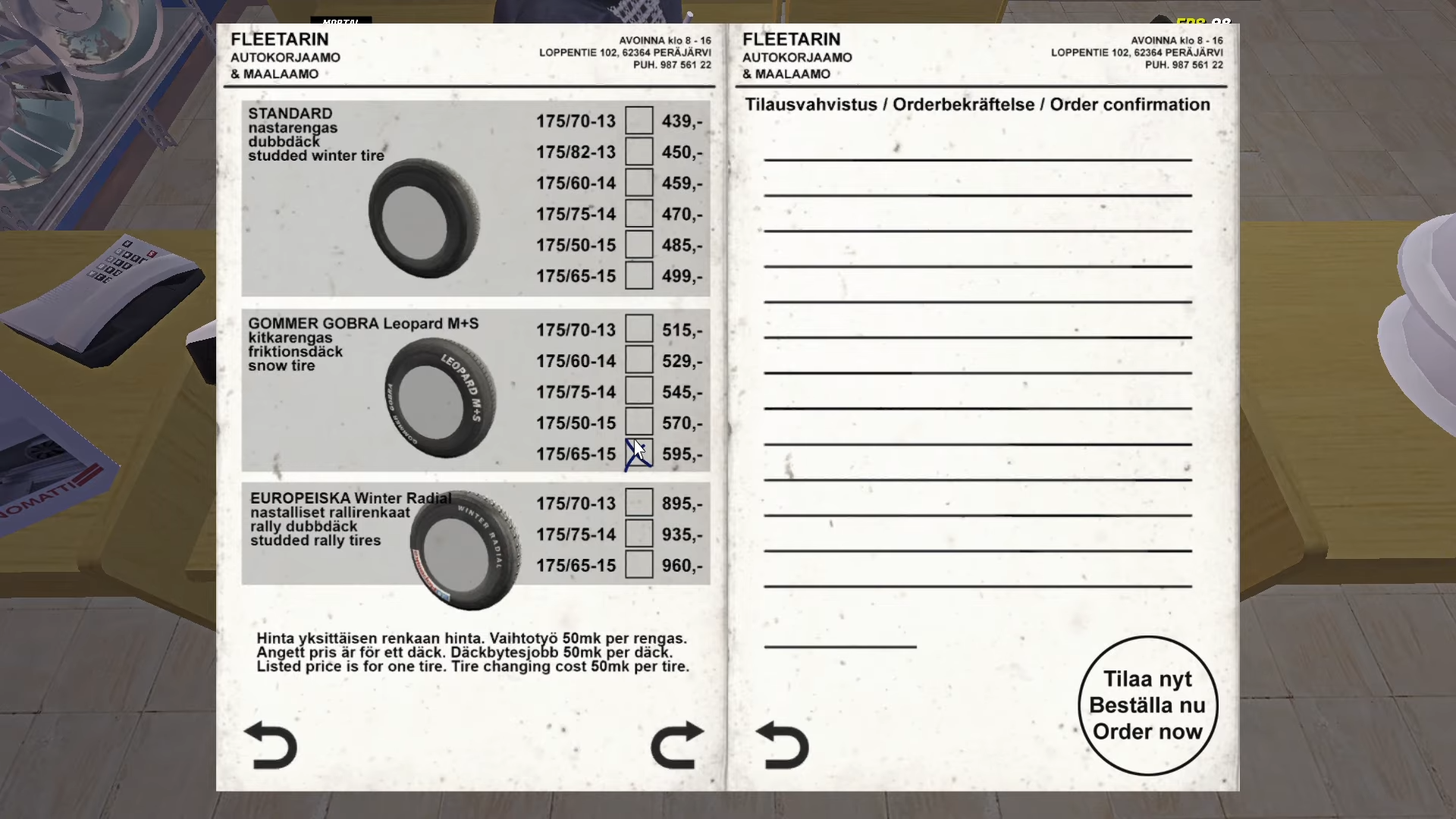 Fleetari offers tire sizes matching 14-inch rims common on Rivett. Standard studded winter tires dominate for the game's snowy theme: 175/70-13 at 439 mk or 175/82-13 at 450 mk per tire. All-season tires suit milder conditions at around 250 mk new, while basic winter tires hit 300 mk and studded 400 mk from parts lists. Mounting adds 50 mk per tire, totaling ~2,000 mk for a full set with changeover.