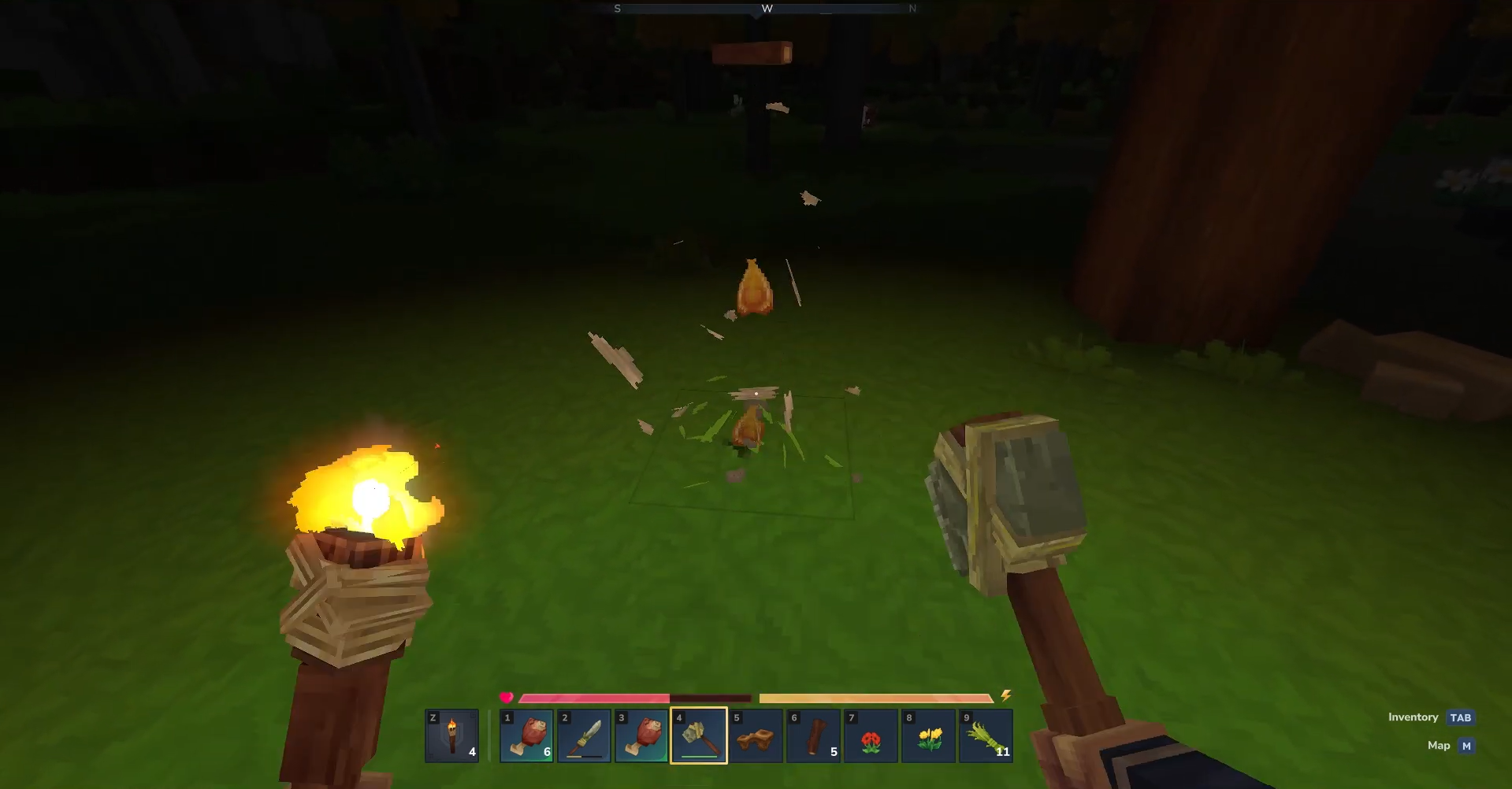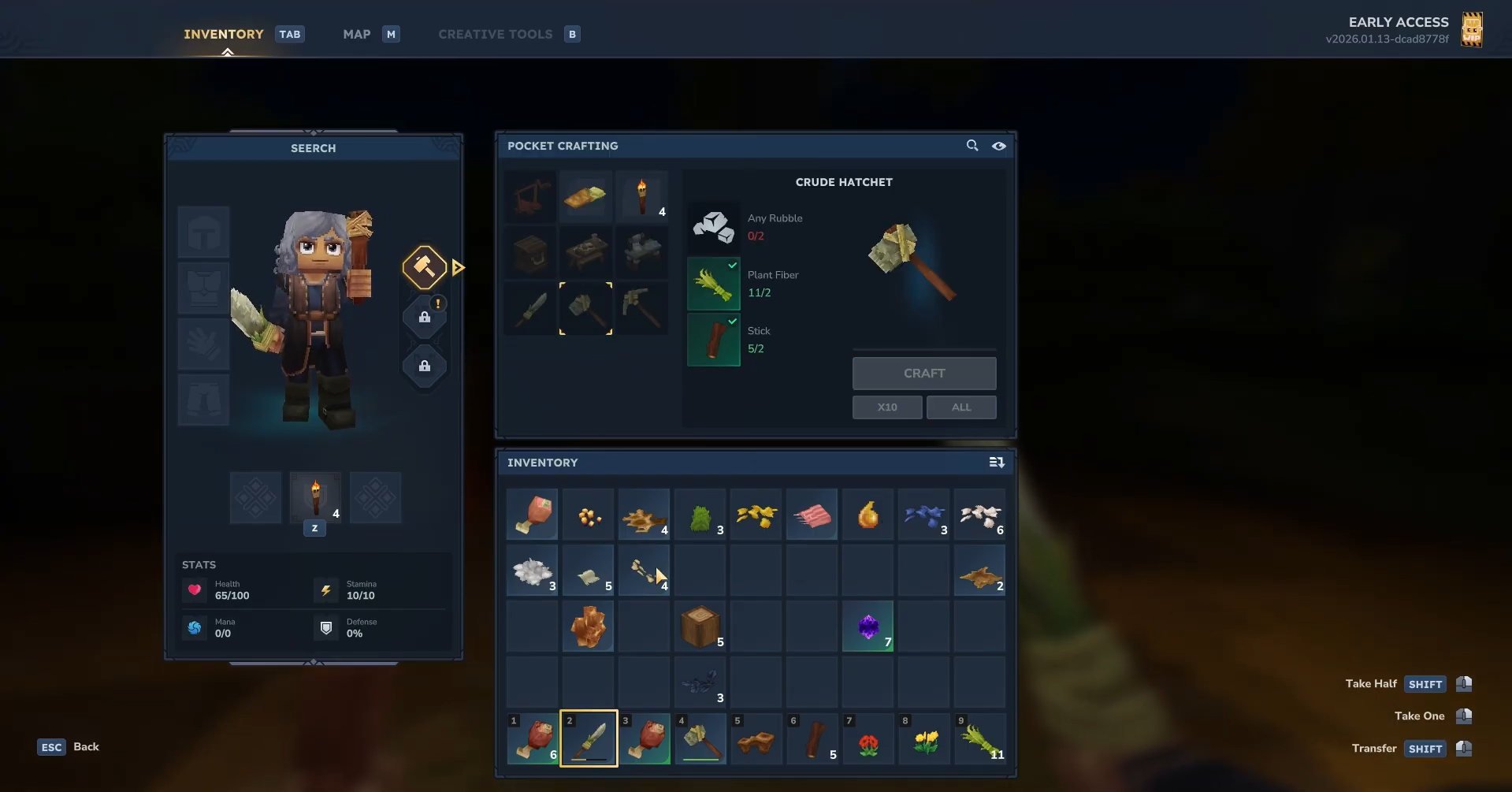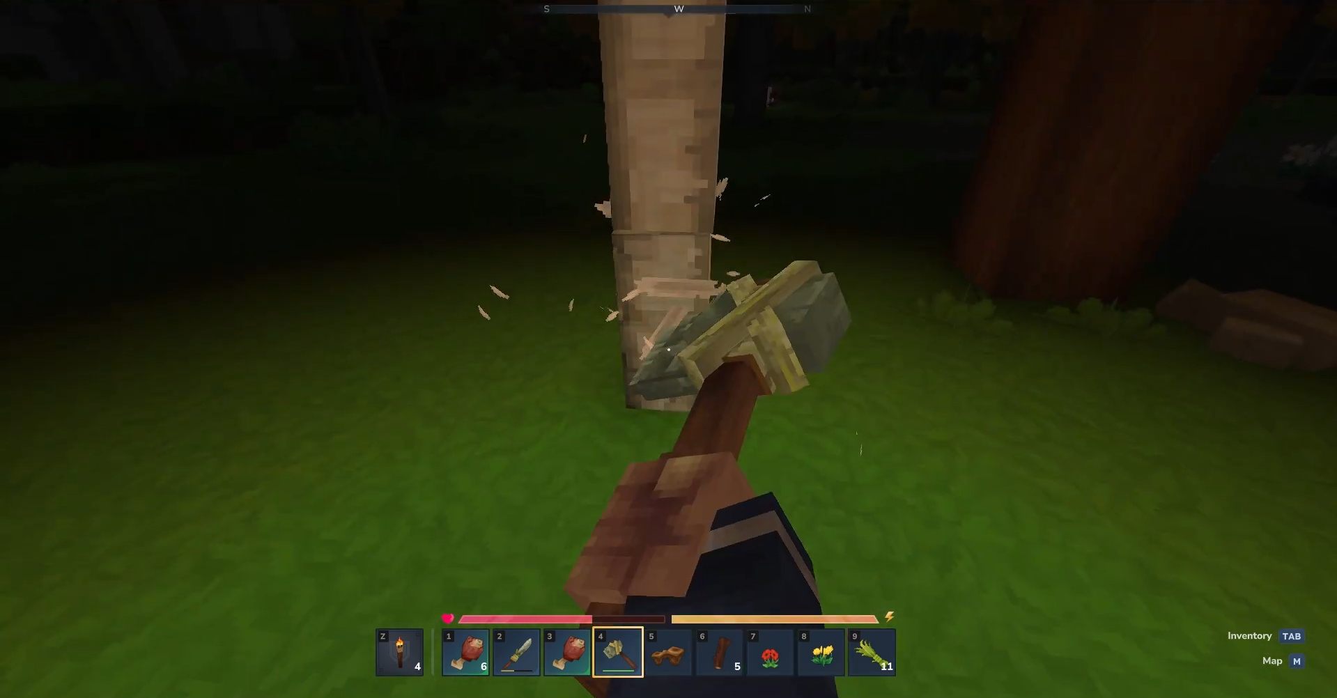 If you don’t already have one, craft a basic axe using sticks and stone (or wood, depending on the recipe) at your workbench or in your inventory crafting grid. You can also find axes in early chests or from NPCs in the hub world.