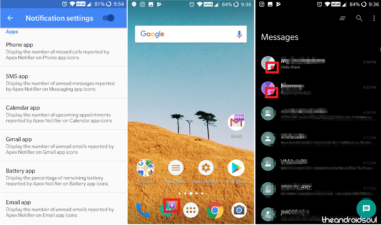 Difference between the two methods here, that is, getting the unread badge via the Nova launcher (plus TeslaUnread) and Apex launcher (plus ApexNotifier).