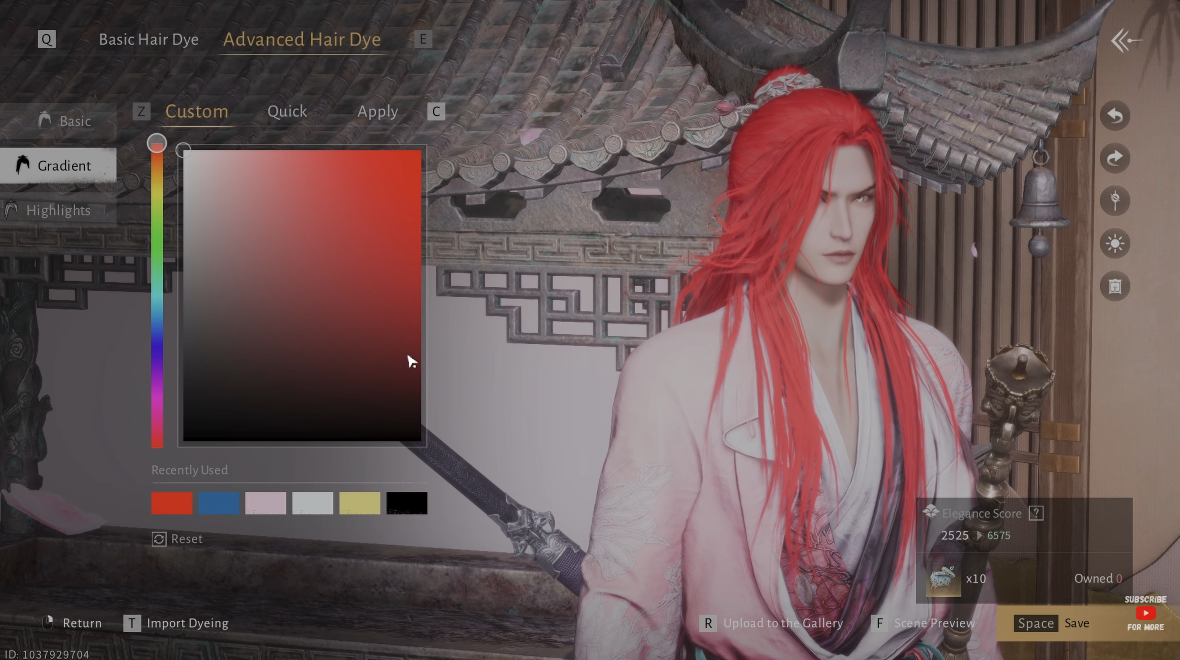 Choose Advanced Hair Dye (Timeless) to access expanded customization options, including base color, gradient, and highlight adjustments. Confirm your selection to apply the change. Each application consumes 10 units of Timeless Hair Dye and supports both custom setups and quick preset options. Changes can be previewed and saved directly on your character.