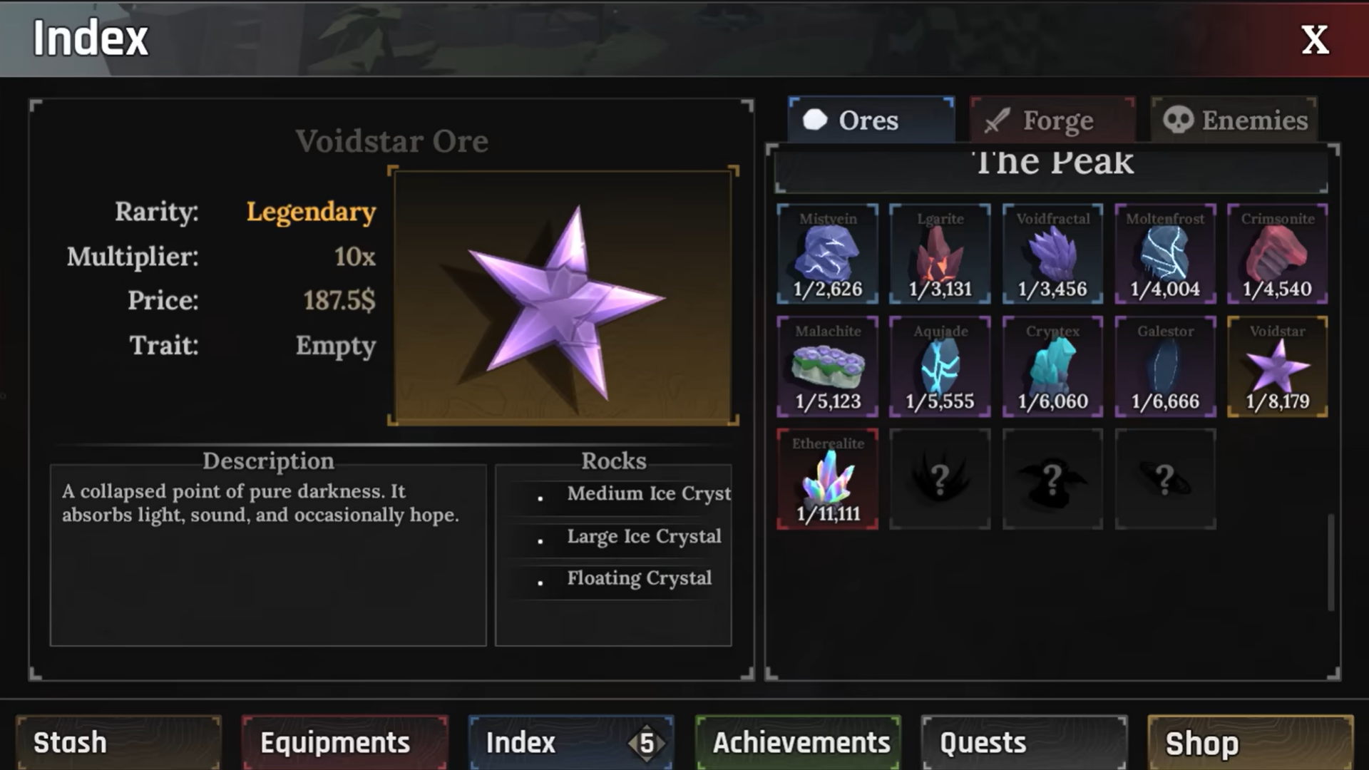 Voidstar sits firmly in the late-game economy of The Forge, rewarding players who invest time into crystal farming and optimized forging. If you’re chasing high critical damage at the cost of survivability, this ore is designed exactly for that playstyle.