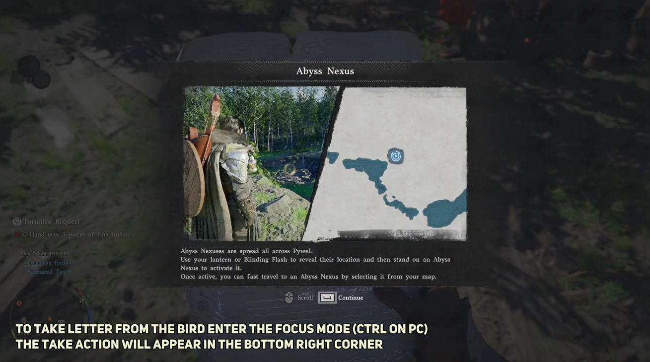 The letter clearly explains that Abyss Nexuses are scattered throughout Pywel, meaning you will encounter them across multiple regions rather than in a single area. They are not visible by default, which is where your tools come into play.