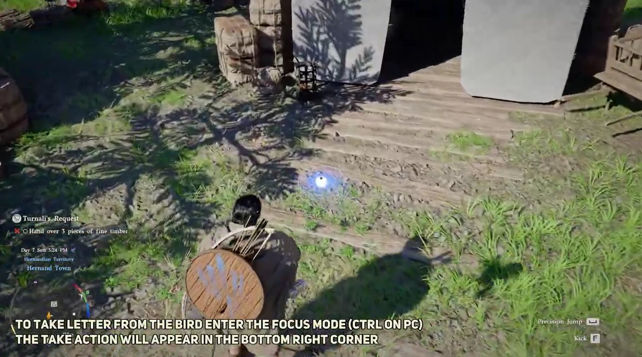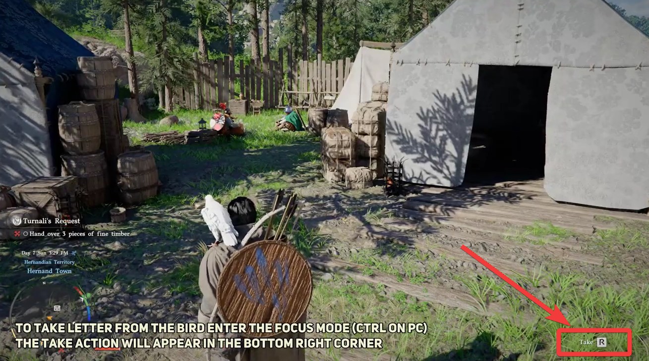 Once you reach the correct point, the White Crow will land on your right shoulder automatically. At this moment, a “Take” prompt appears at the bottom-right of your screen.
