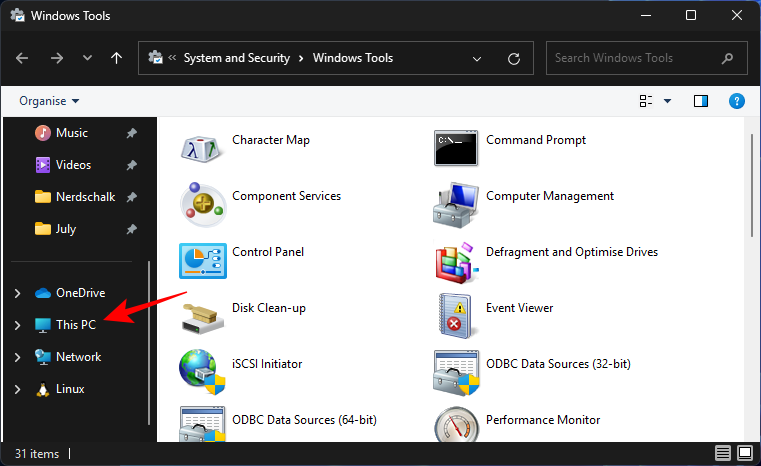- Windows Tools opens by default in the old File Explorer. So all you need to do is to click on This PC in the side panel.