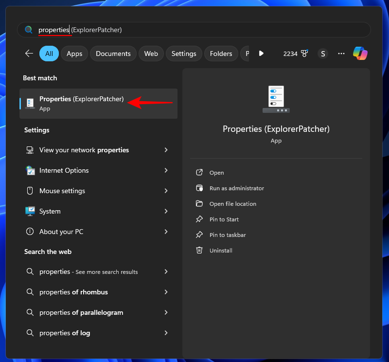 Note: This may not be the case on recent Windows Insider editions. But you can use the next step to check if the installation is completed successfully. - To restore the classic File Explorer, press Start, type Properties and select the ‘Properties [ExplorerPatcher]’.