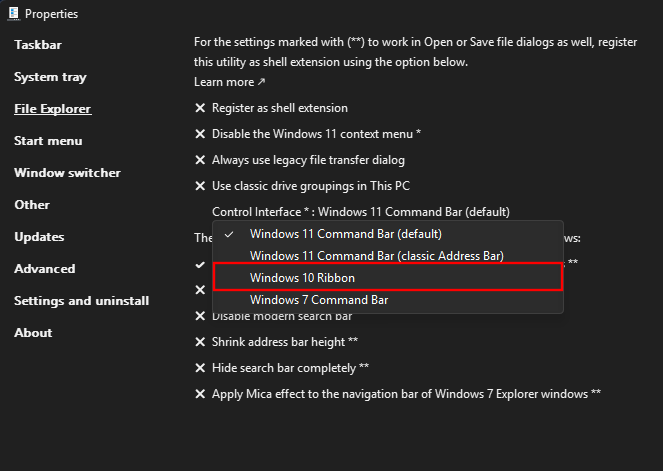 - For a more permanent solution, install ExplorerPatcher, open ‘Properties [ExplorerPatcher]’ from Start. Then go to ‘File Explorer’ and change ‘Control Interface’ to ‘Windows 10 Ribbon’.