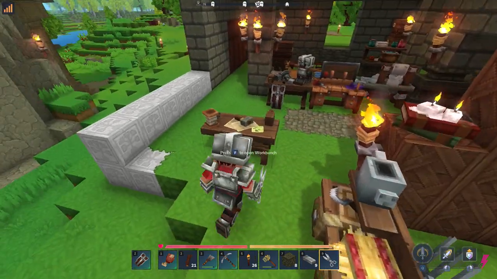 Place the workbench on the ground and interact with it to open its crafting interface.