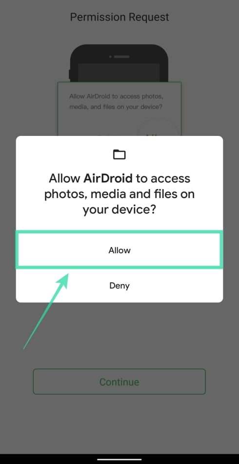 Step 4: Allow AirDroid access to your storage by tapping on Continue on the next screen and then tap on Allow when prompted to confirm.