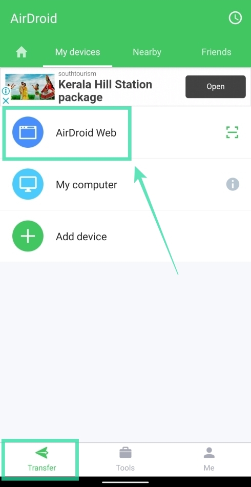 Step 5: You will now arrive on the app’s home screen. Inside the Transfer tab, tap on AirDroid Web.