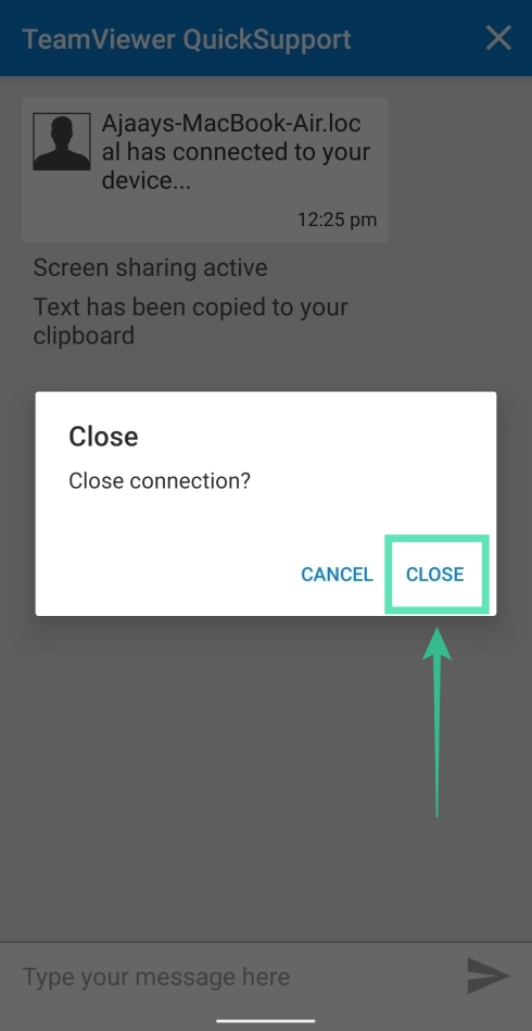 That’s it! Your Android screen will now appear inside the Remote Control tab on the TeamViewer app on PC. To end the session, tap on the close icon at the top right corner on the mobile app and tap on Close.