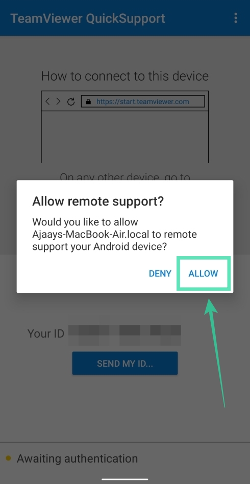 Step 5: Upon clicking Connect on PC, the TeamViewer QuickSupport app on your phone will prompt you if you want your PC to remotely access your phone. Tap on Allow.