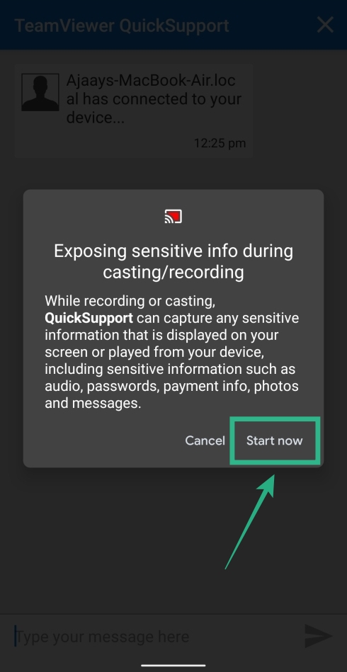 Step 6: On the next screen, you will be prompted whether you want TeamViewer QuickSupport to access your Android screen. Confirm by tapping on Start now.