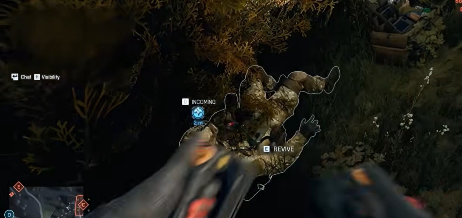 - Approach an injured teammate and deploy a supply kit (PC: “X”, Console: “Up” on D-pad) to heal them.