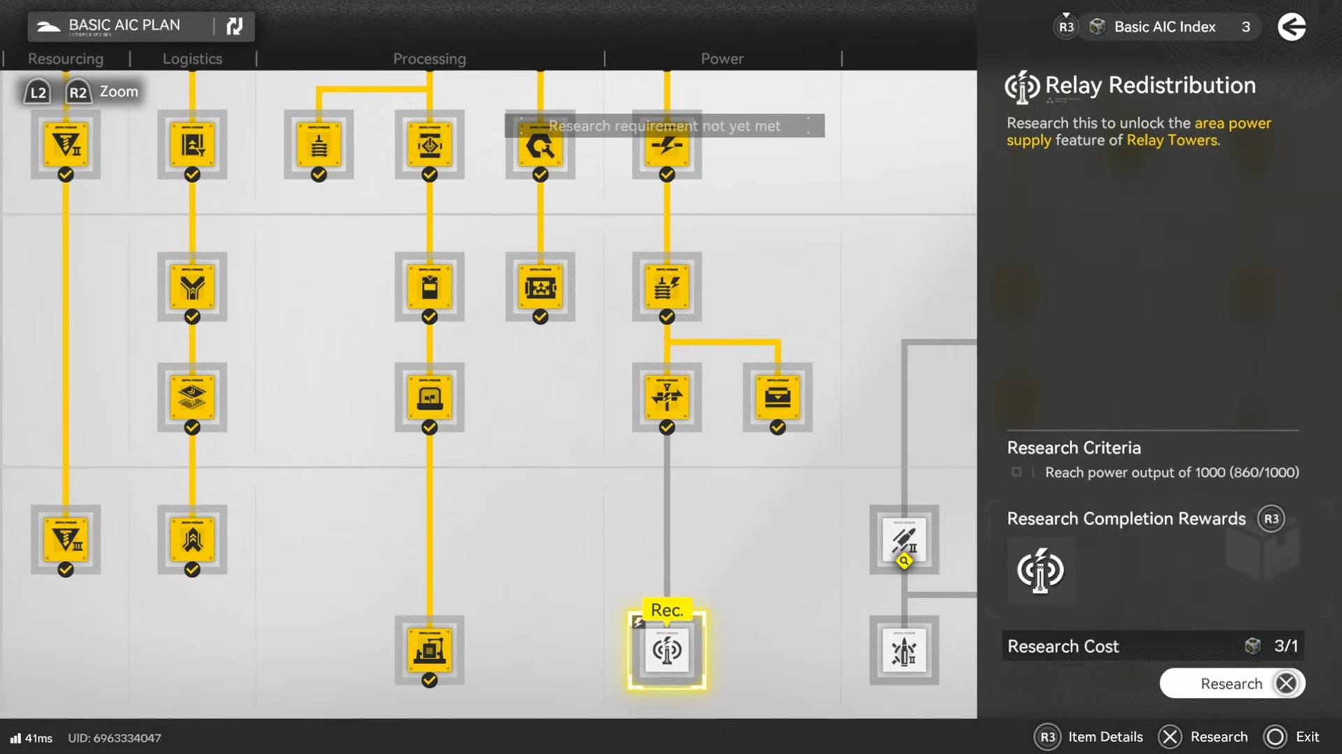 | Relay Redistribution | Basic AIC III (Basic AIC plan) | Supplies power over a wider area using a Relay Tower | Must reach 1000 power output before it can be purchased/researched |