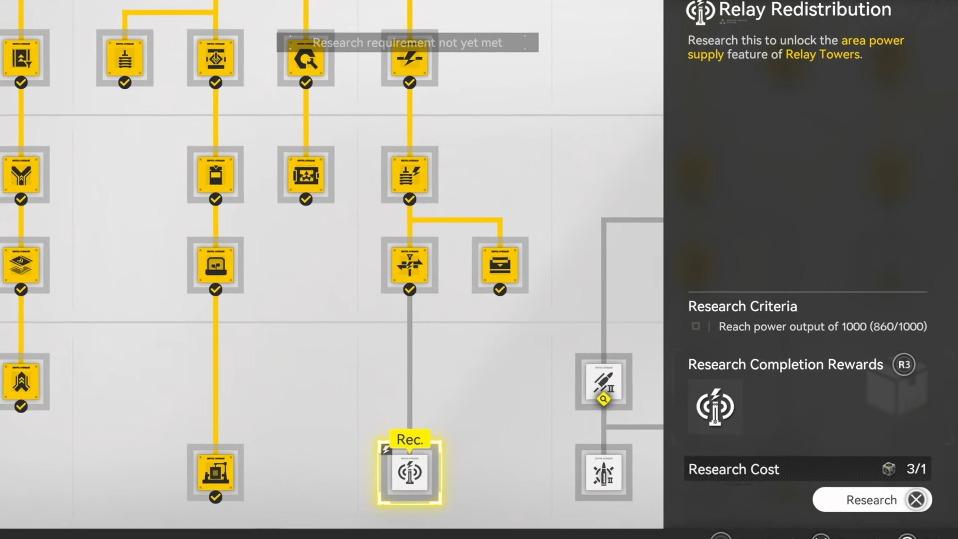 - The research may appear “locked” until the base hits a power output requirement of 1000.