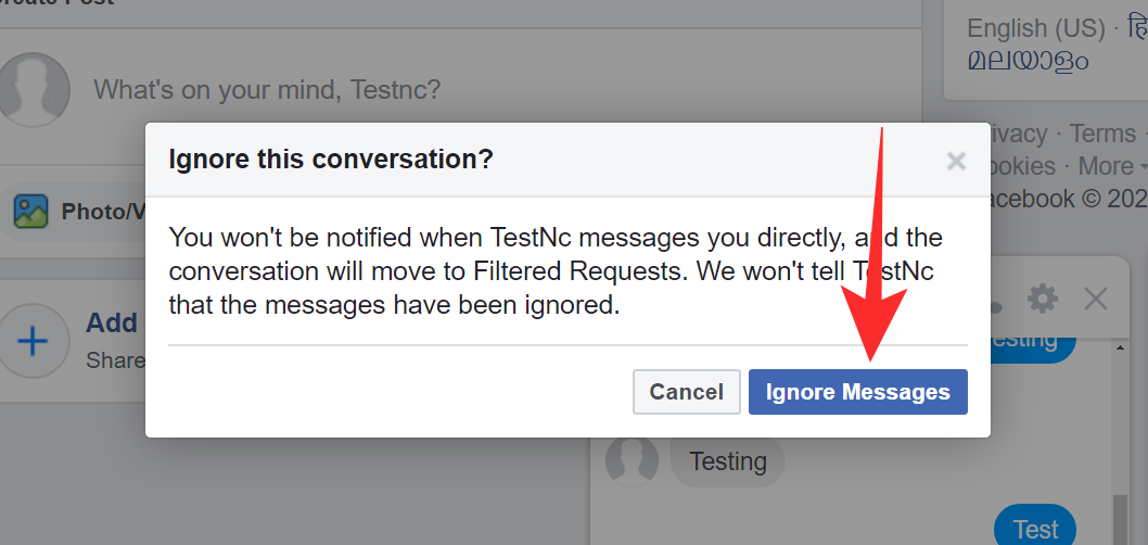Confirm your choice to Facebook by clicking on ‘Ignore Messages’ again.