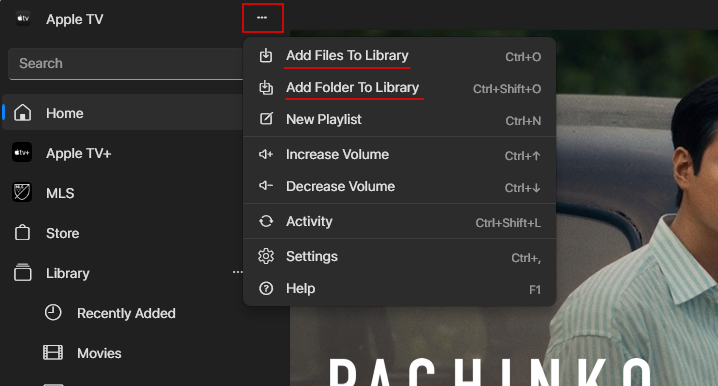 Open the Apple TV app and log in to your Apple account. Then click on the three-dot icon in the top left corner and select Add files to library or Add folder to library.