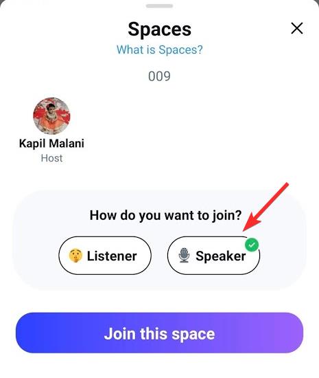 If the host invited you as Speaker, then you will get the option to choose between Listener and Speaker. Well, simply tap Speaker to join the Space as a speaker.