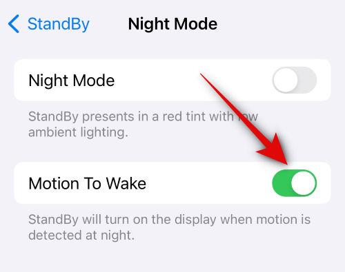 If, despite using both of the tricks mentioned above, you still find StandBy getting disabled on your iPhone, then we recommend you disable Motion to Wake on your iPhone. You can do so by heading to Settings > StandBy > Night Mode > Motion to Wake