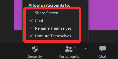 Additionally, you can also decide what the participants can or cannot do in your Zoom meeting with these setting options in the same Security menu.