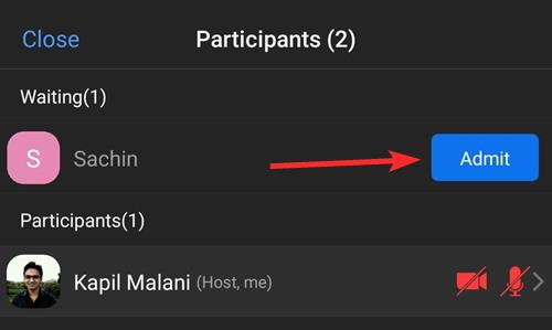 You will see the users you can let in under the ‘Waiting’ section. Tap on Admit to allow the user to join the meeting.