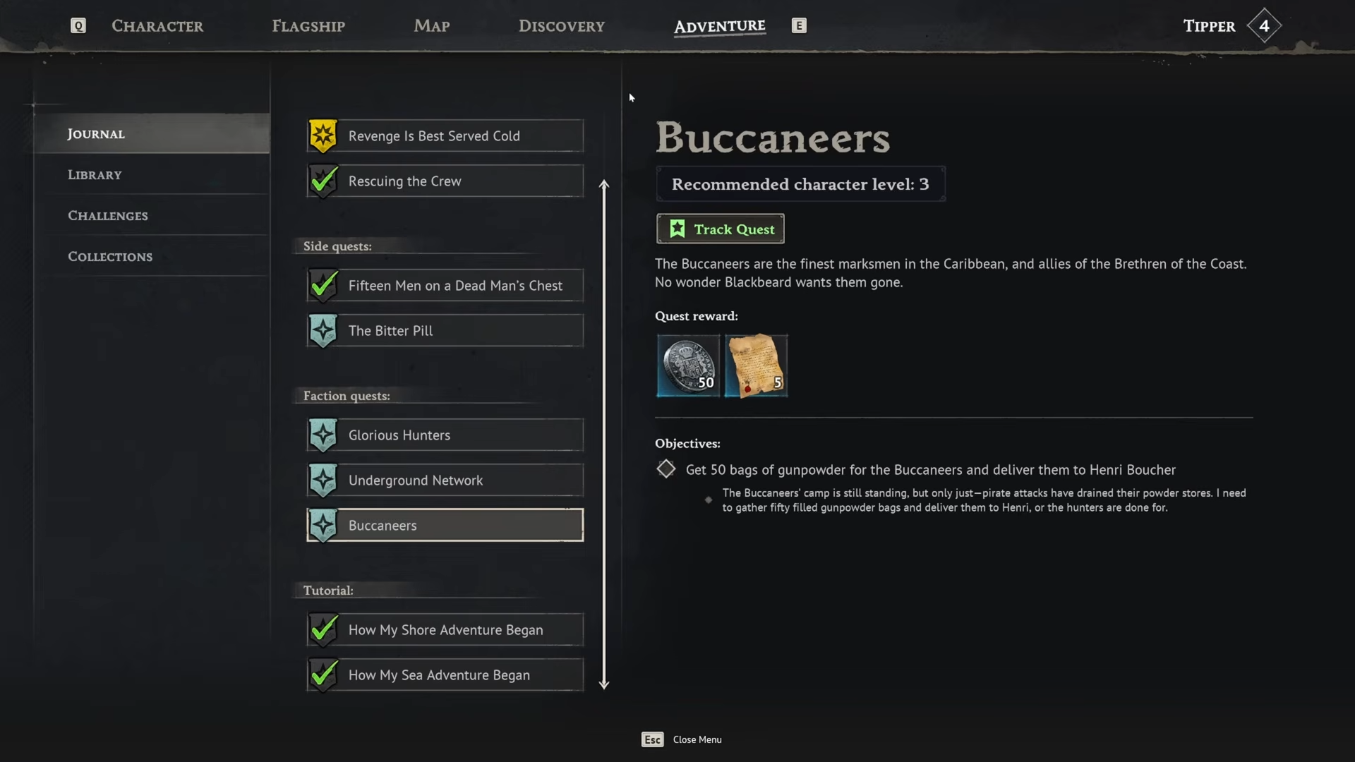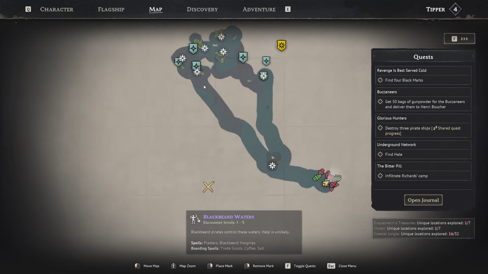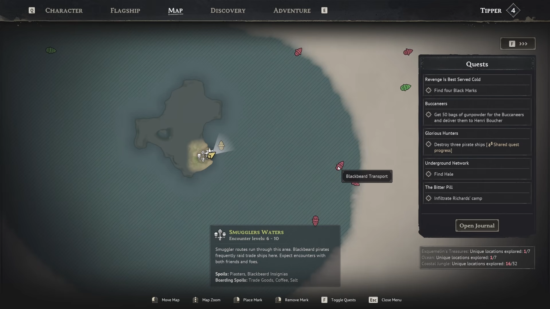 Check your Journal constantly—main quests unlock biomes and give huge XP (hundreds per chain). Side quests pop during POIs if they log there. Ignore Blackbeard Crew Maps (loot only, no XP).