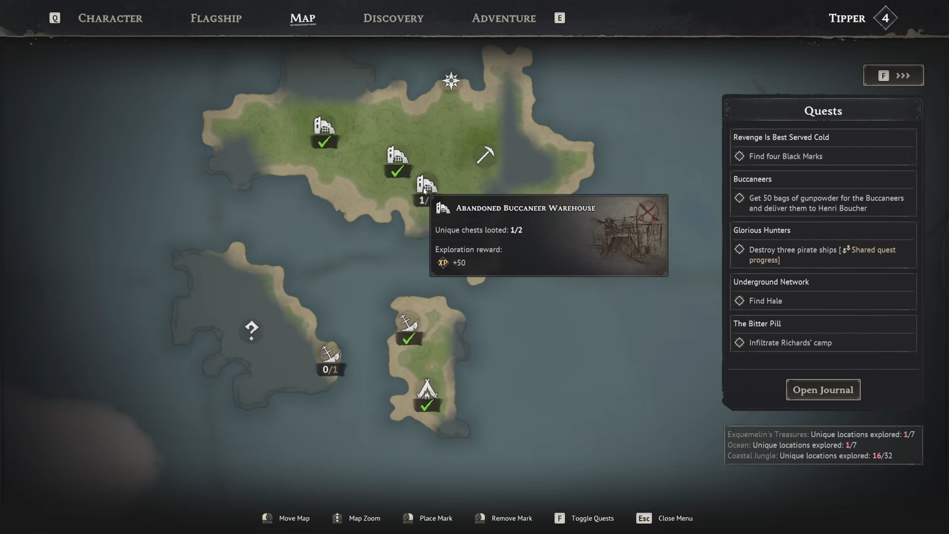 Points of Interest appear as question marks on your map across islands, including pirate camps, ancient ruins, traveler’s camps, jungle caves, and shipwrecks. The map previews chest counts per site—loot them all to trigger XP, which scales by size.