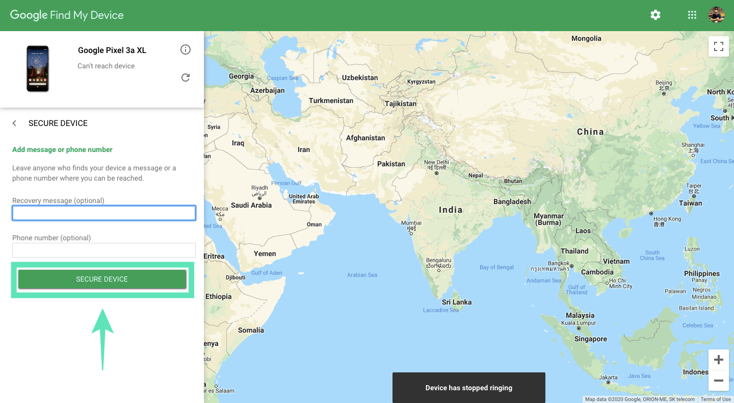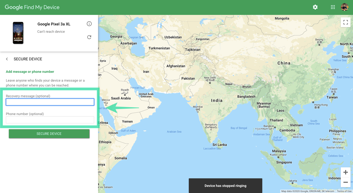If you cannot track your lost phone, you can select the Secure Device option to lock your smartphone and set a new password to unlock it. Once you choose this option, a recovery phone number with a message will be displayed on the lost phone so that if someone finds the device, they can reach out to you. This can be useful in making sure nobody is accessing your data as a new password makes sure your device will be locked automatically.