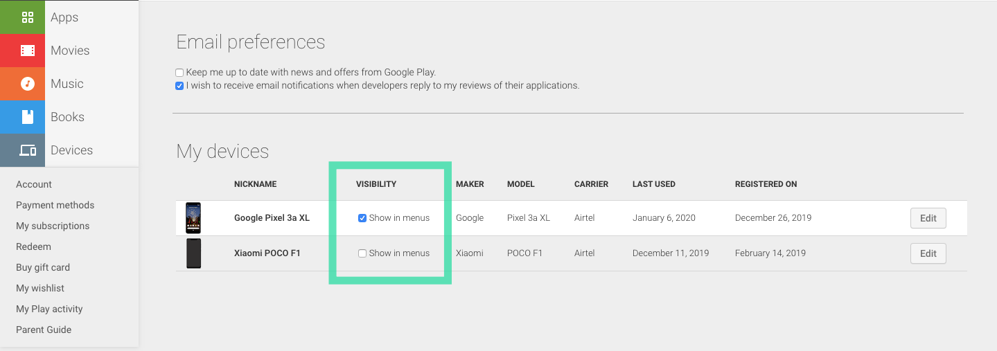 - Make your device visible on Google Play: Open the Google Play device settings page and check the box adjacent to the device you want to track.