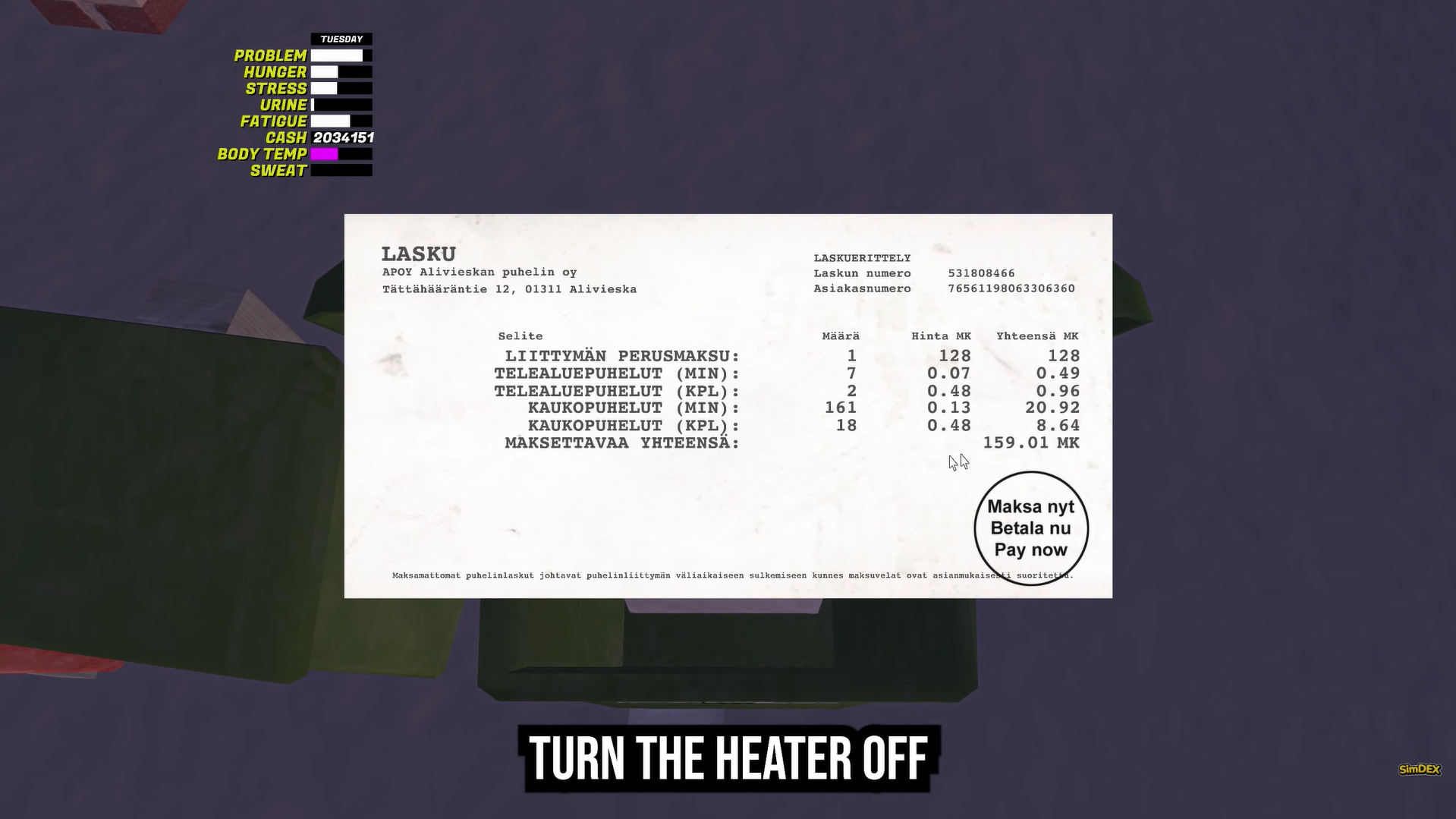 In My Winter Car, managing electricity and phone bills for both your apartment and old house is crucial. Each location has its own meter, and failing to pay electricity shuts down lights, heaters, and appliances, leaving rooms cold even after payment. Skipping the phone bill prevents calls for taxi jobs, so staying on top of both is key to keeping your finances, and gameplay, running smoothly.