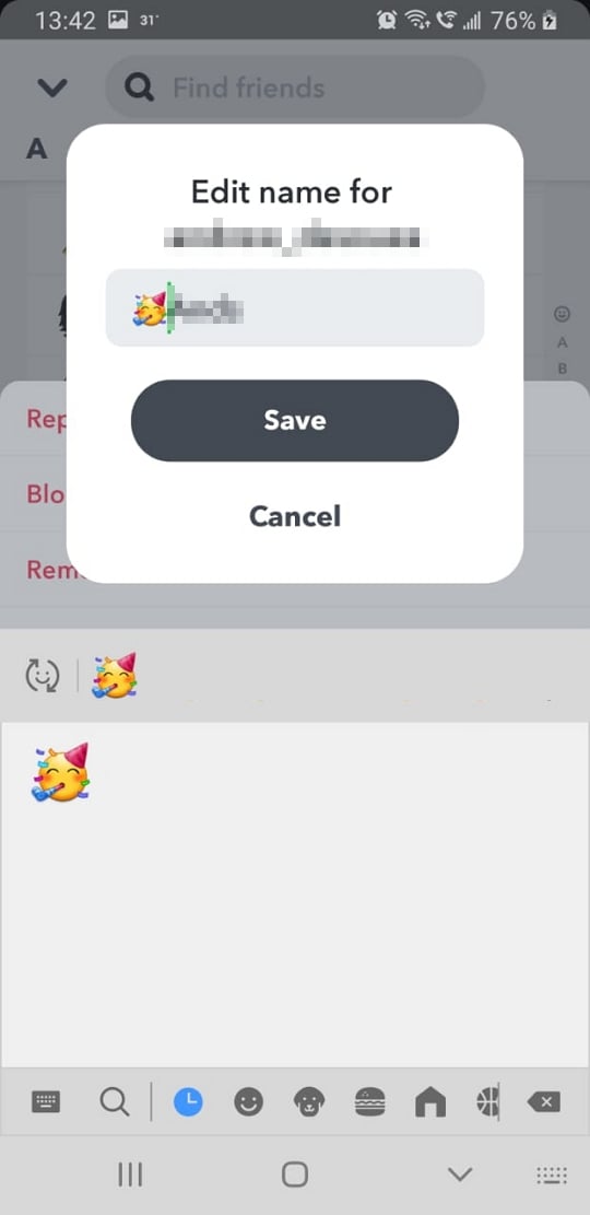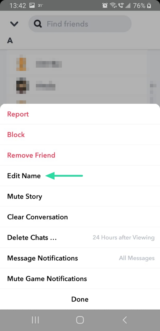 Now you need to rename these contacts. Don’t worry, this will not change their contact name in your phone. To change a user’s name, tap and hold on the contact, select More > Edit name. You do not need to change the name completely, just add a symbol before it. This could be anything, a dot, #, $, or even an emoji! Adding a symbol to the user’s name will send it to the bottom of the alphabetical list. Note: You must set the same symbol for all the people that you would like to maintain a Snapstreak with.