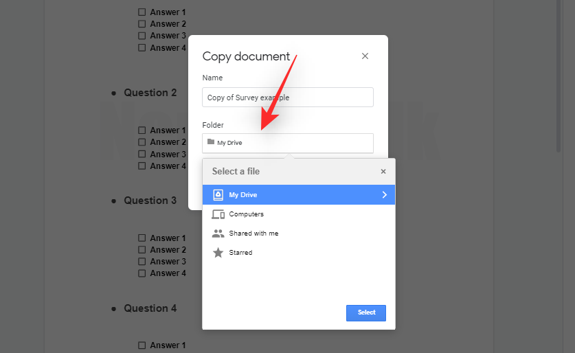 Now choose a location for your survey’s copy by clicking on the next option.