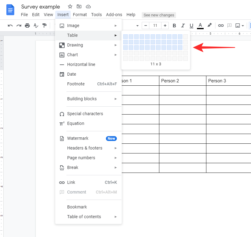 Such forms will allow you to share your survey with your audience with the permission to comment. To add a table to your Google Docs file, go to Insert > Table and then select the desired size of the table that best fits your needs.