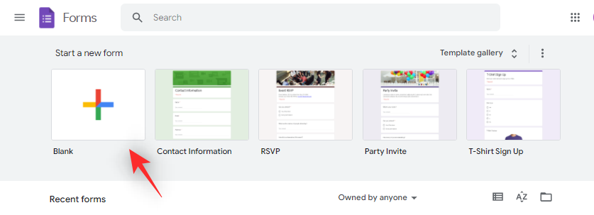 Visit Google Forms in your desktop browser and click on ‘Blank’ at the top to create a survey from scratch. You can also use the Template gallery offered by Google to choose a relevant template for yourself. We will, however, be using the ‘Blank’ template for this guide.
