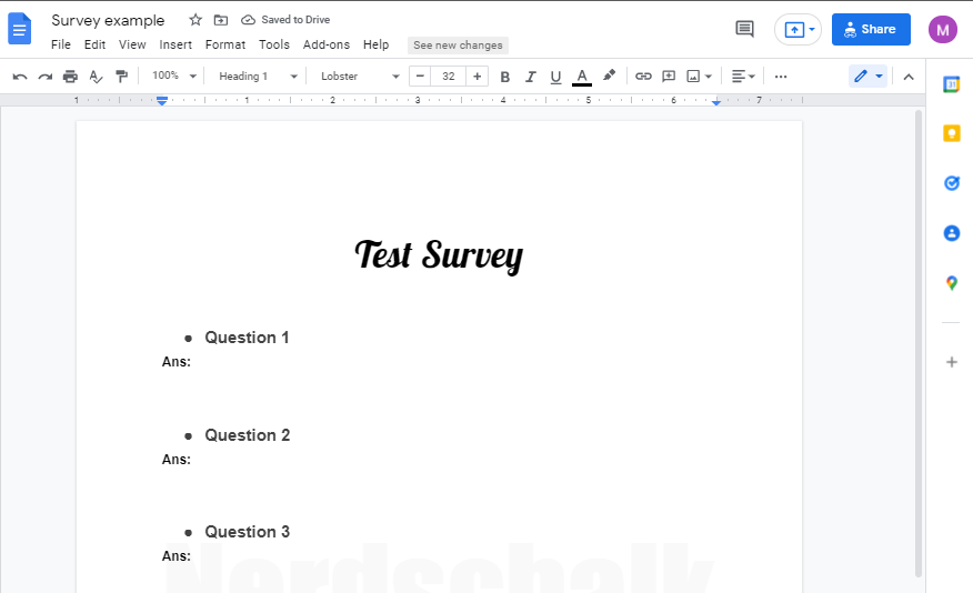 Text-based surveys are quite simple with simple questions and placeholders for answers. You can fill in your questions and use Google Docs to make your textual survey form more attractive.