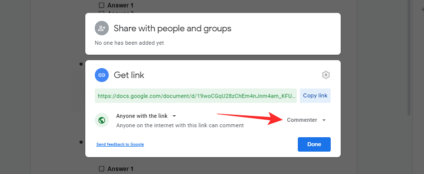 Click on the drop-down menu for permissions and select ‘Commenter’.