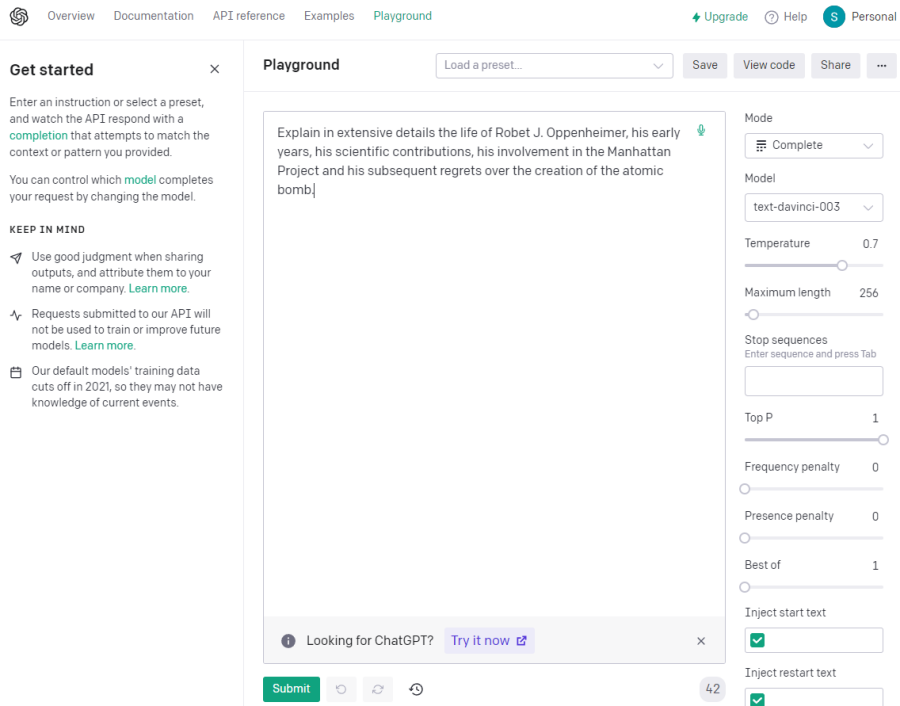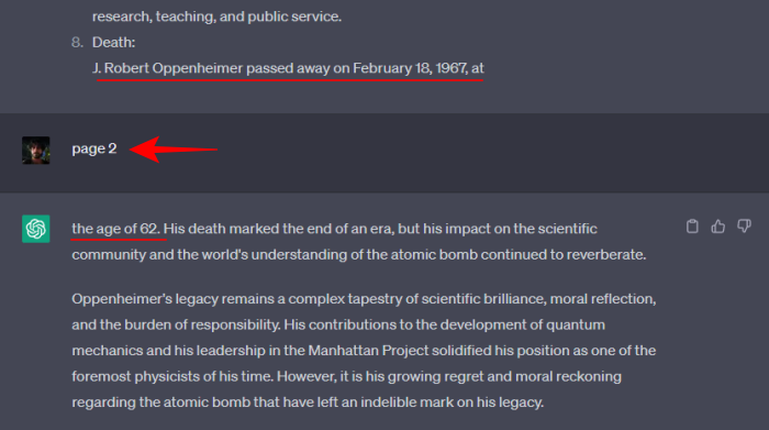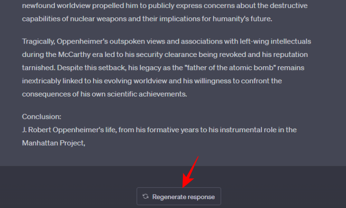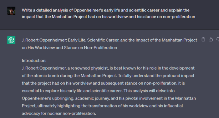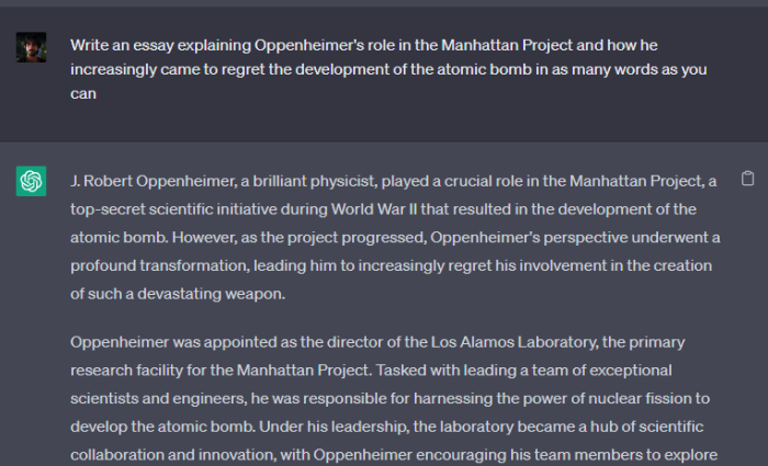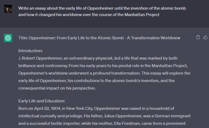 In our example above, we prompted ChatGPT to write an essay on Oppenheimer’s earlier life (first bit), career (second bit), and how the Manhattan Project changed his worldview (third), and his stance on non-proliferation (fourth).