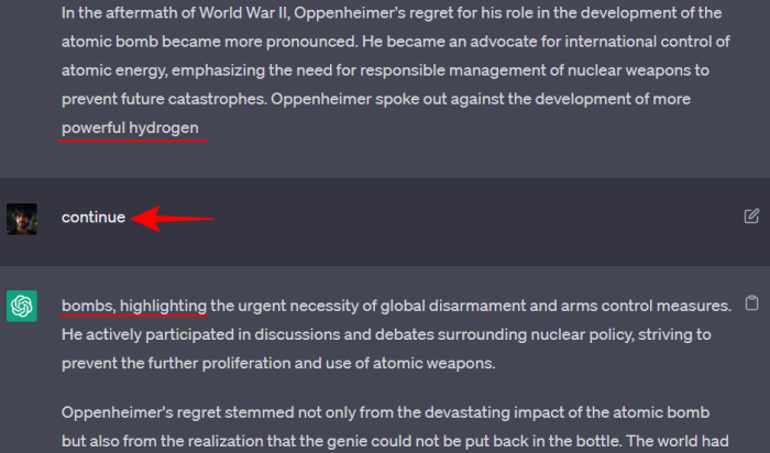 Regardless of whether you’ve specified the word limit or prompted it otherwise to write a longer piece, ChatGPT will at some point hit its token limitations and stop replying, leaving you with a truncated answer that will need to be completed. In such a case, simply ask it to ‘explain’, ‘continue’, or ‘go on’. These prompts will nudge ChatGPT to continue from where it left off and complete the response.