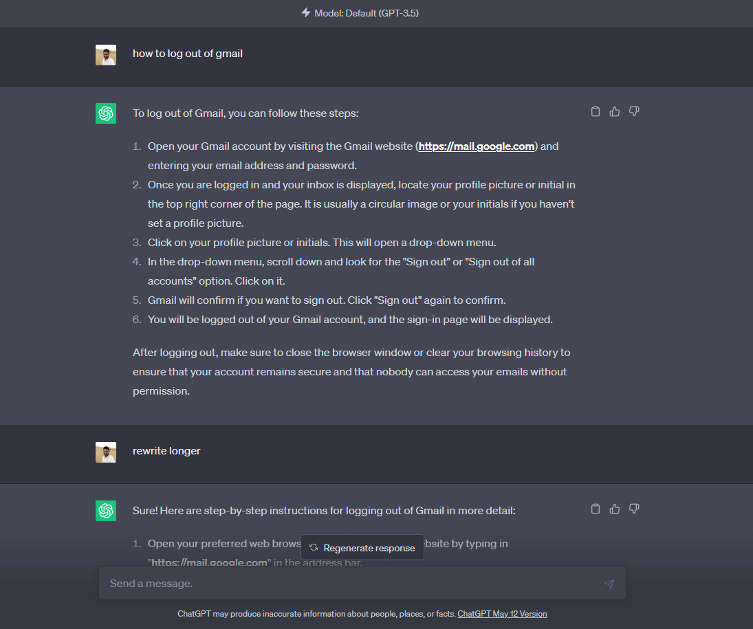 Sometimes, clicking on the ‘Regenerate response’ button can get you longer answers than those given initially by ChatGPT. This may not always work, but it’s definitely something that one can try, given especially how easy it is to do.