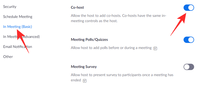Then, head over to the ‘In Meeting (Basic)’ tab and look for the ‘Co-host’ toggle.