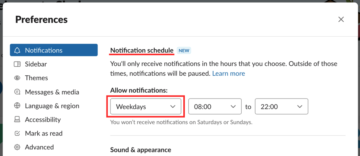 Slack’s ‘Pause notifications’ feature allows you to set a notification schedule which makes sure that you’ll only receive notifications during the days and hours that you choose to get them.