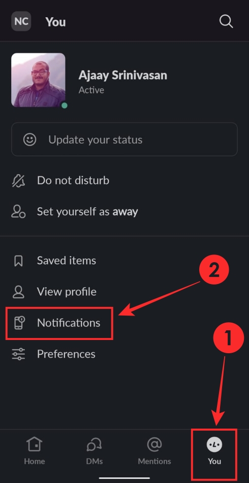 Similar to scheduling them on the PC, you can manage notifications from Slack on your phone. You can do so by tapping on the ‘You’ tab at the bottom right and selecting ‘Notifications’. In the next screen under ‘General Settings’, select the ‘Notification schedule’ option.