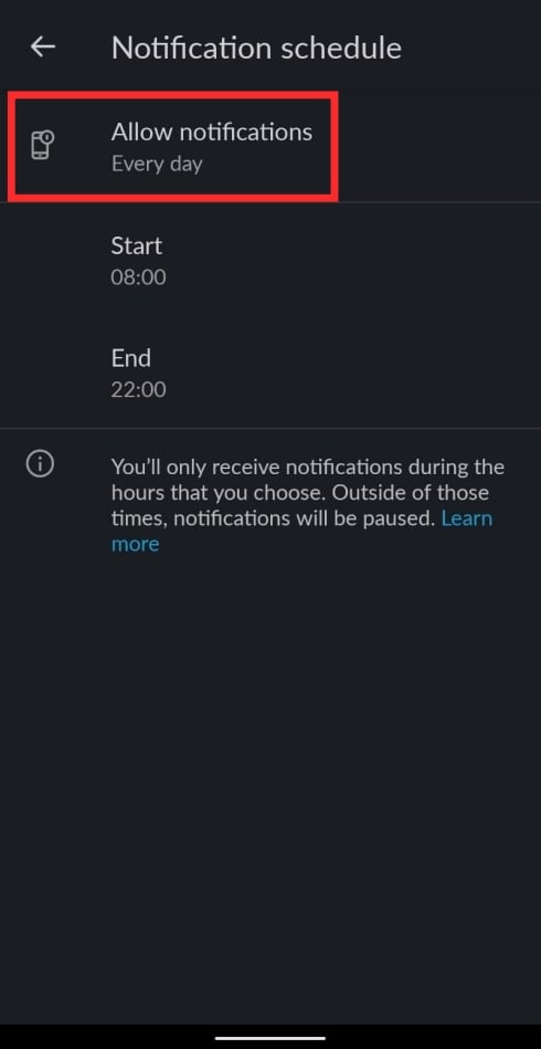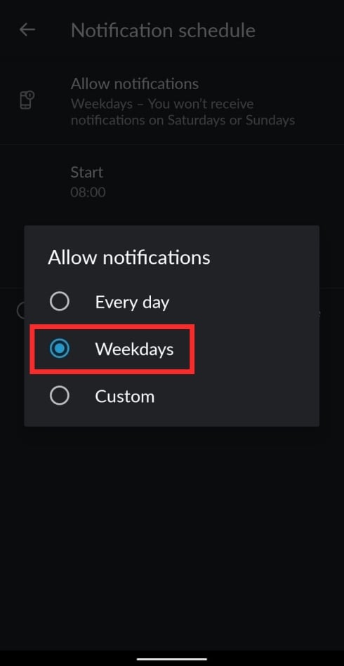Tap on the ‘Allow notifications’ box and select the ‘Weekdays’ option. You can then choose a start and end time during which period you’ll get notifications for all the activities on your Slack workspace.