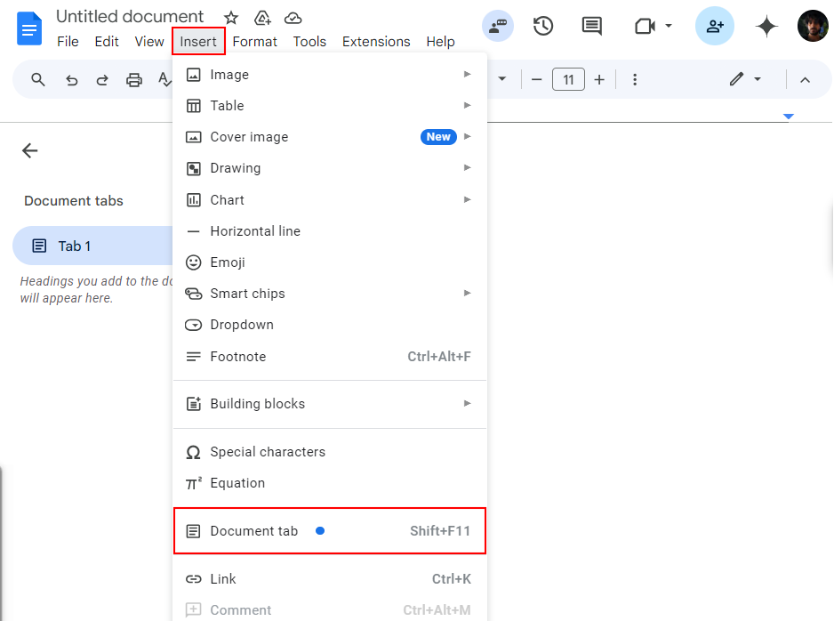 - Access Tabs from the document outline (three bullet-point icon in top left). It’s also available under Insert > Document tab (or with