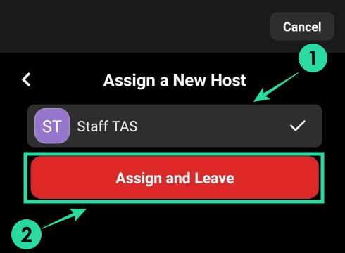 Step 3: Now tap on the Leave Meeting option, select the participant you want to assign host controls to, and tap on Assign and Leave.