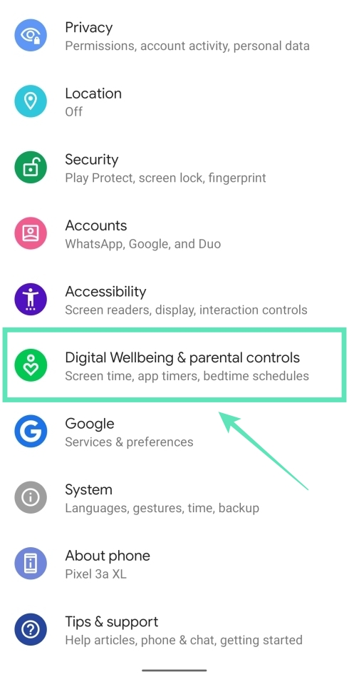 2. Scroll down and tap on Digital Wellbeing & parental controls.